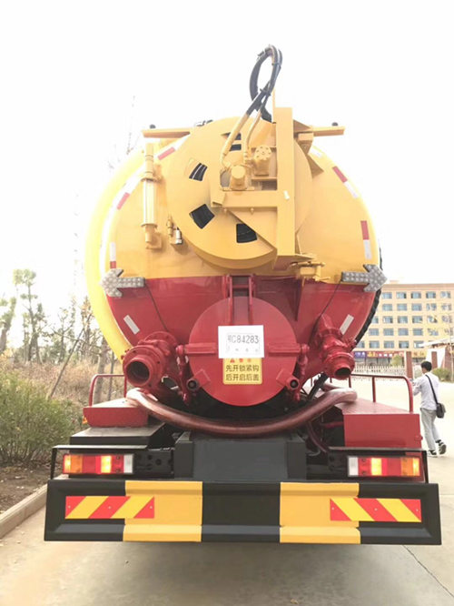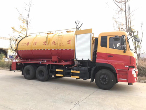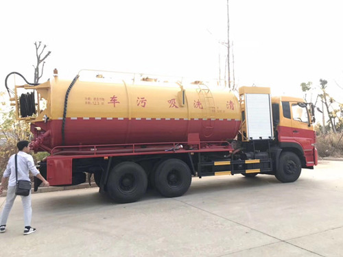 吴先生订购的这辆东风天龙吸污车配置为:程力威高压清洗吸污车,底盘型号:DFL1250A13,东风公司原装底盘,新款驾驶室,法士特8档变速箱,7T前桥,10T后双桥,轮胎为11.00钢丝胎,康机270发动机,正宗国五排放标准。根据客户要求:该高压清洗吸污车采用一体罐改装,天津通洁270L泵,清水罐容积约5方,污水罐容积约15方,原厂空调,副发动机用的是420马力潍柴。